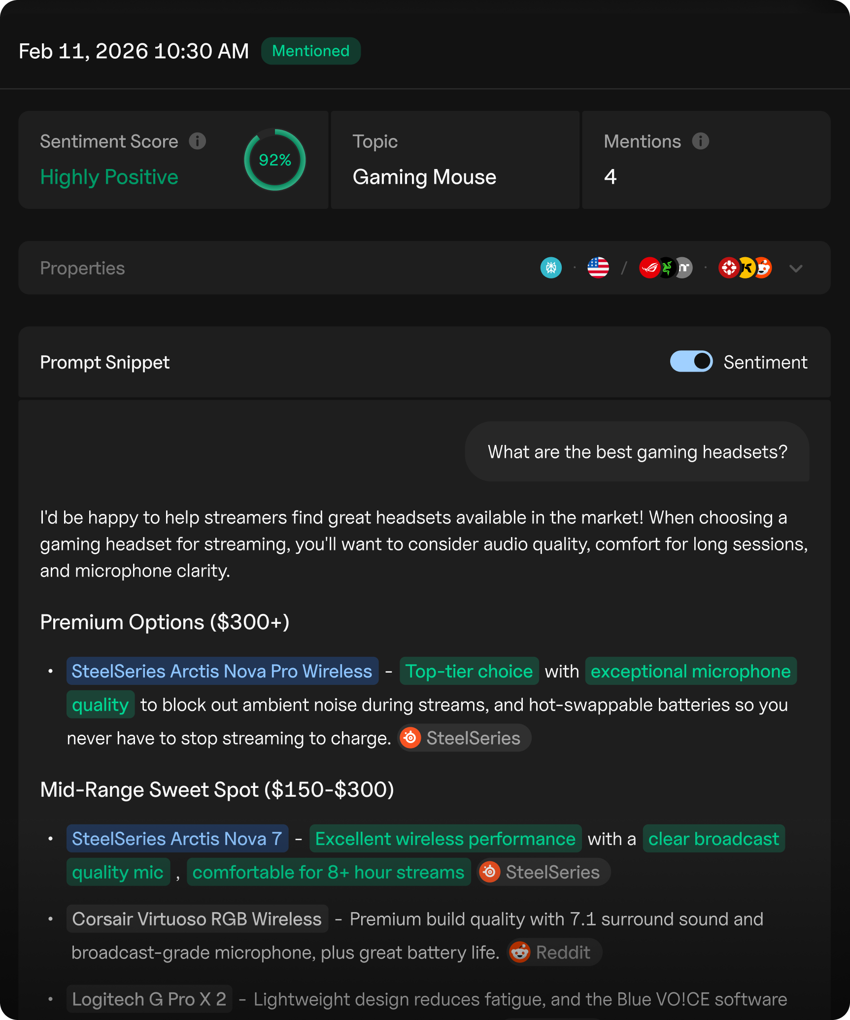 The platform tracks mention frequency by individual product, ranking position in shopping comparisons, competitor product placement, and price mention accuracy across all major AI shopping surfaces.