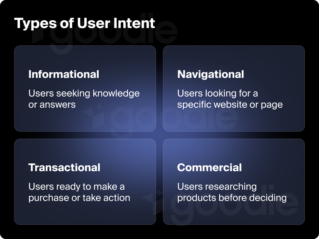 Content that addresses the underlying reason behind a search query performs better on Perplexity. The first step is to understand what user intent is so you can analyze where your customers will most likely be searching. This way the content you create can address their concerns. There are four main types of user intent:
