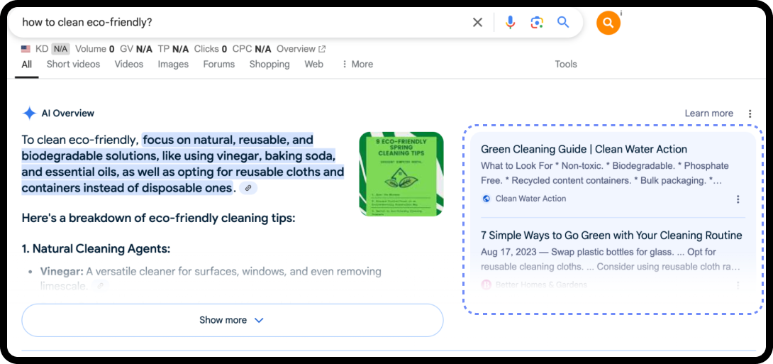 For GEO, they might structure content to answer common questions like, "What are the benefits of eco-friendly cleaning products?" in a way that’s clear, concise, and conversational. This makes their content more likely to show up in an AI-generated response when a user asks about eco-friendly cleaning options on an AI search engine like ChatGPT or Google’s AI Overview section of the SERP.
