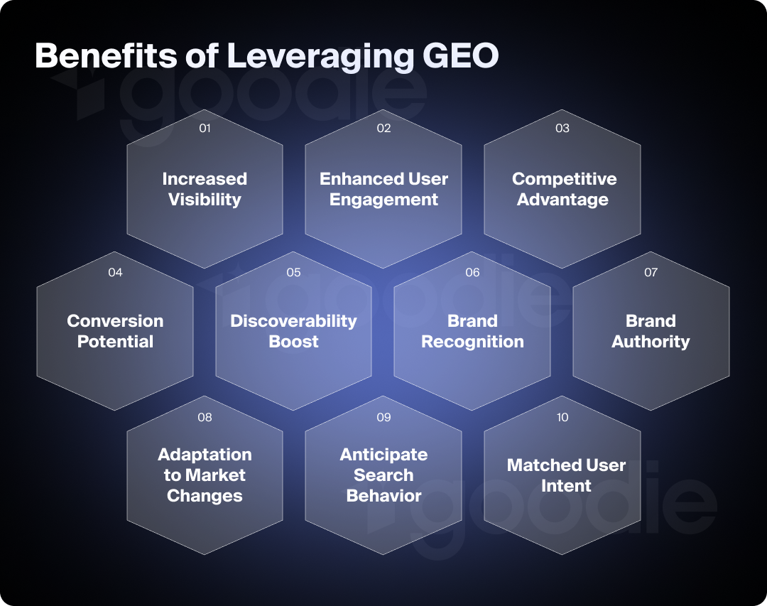 Benefit: GEO allows businesses to be agile, responding quickly to new developments in search technology and consumer behavior, ensuring ongoing visibility and relevance despite changing algorithms and user preferences.