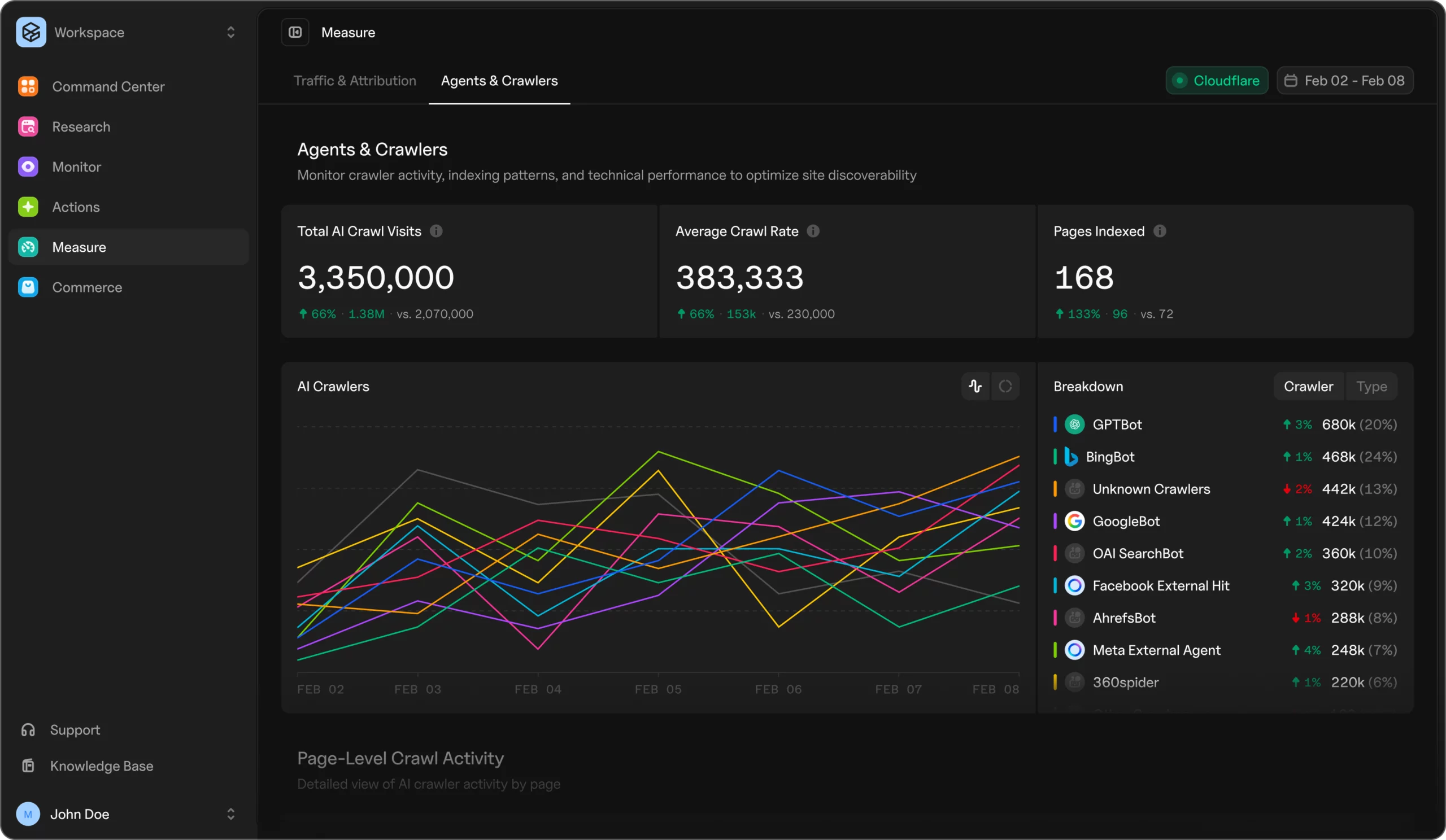 Monitor which AI bots access your content, track crawl frequency and patterns, and close technical gaps that prevent visibility before they cost you citations.