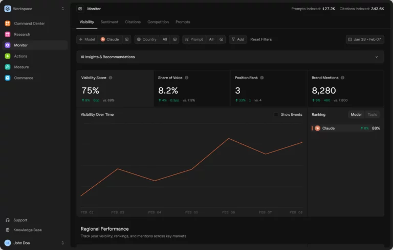 Yes. Visibility Monitoring shows the specific prompts where Claude mentions your brand, along with volume data, competitive context, and sentiment analysis.