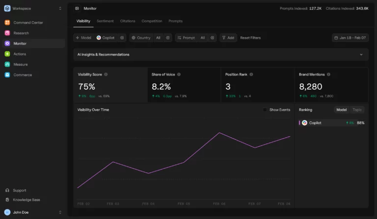 Track Copilot mentions, citations, sentiment, and competitive positioning across productivity and enterprise contexts.